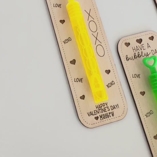 Each card is cut from 1/8” Baltic birch, engraved with your chosen saying, and personalized with your child’s name. A mini tube of bubbles is attached to every card — fun, cute, and candy-free!