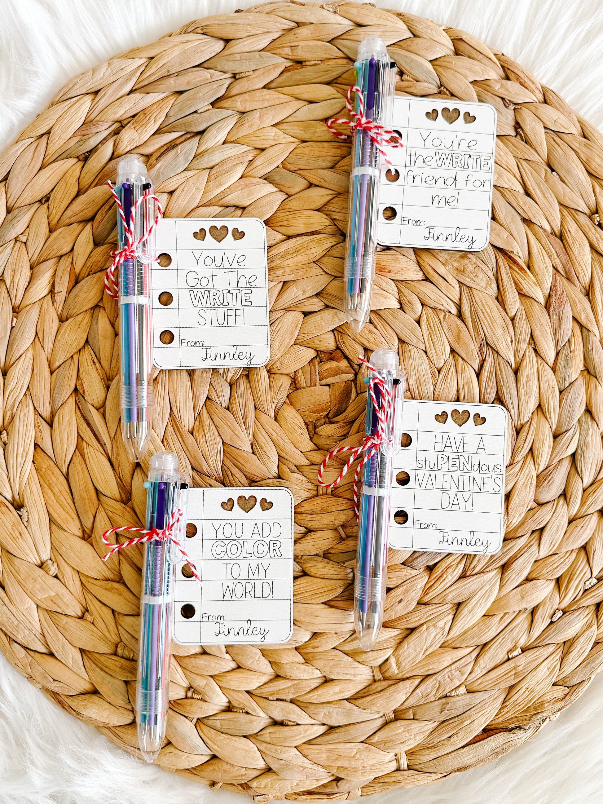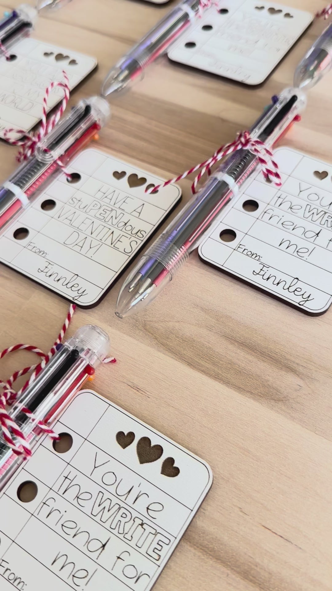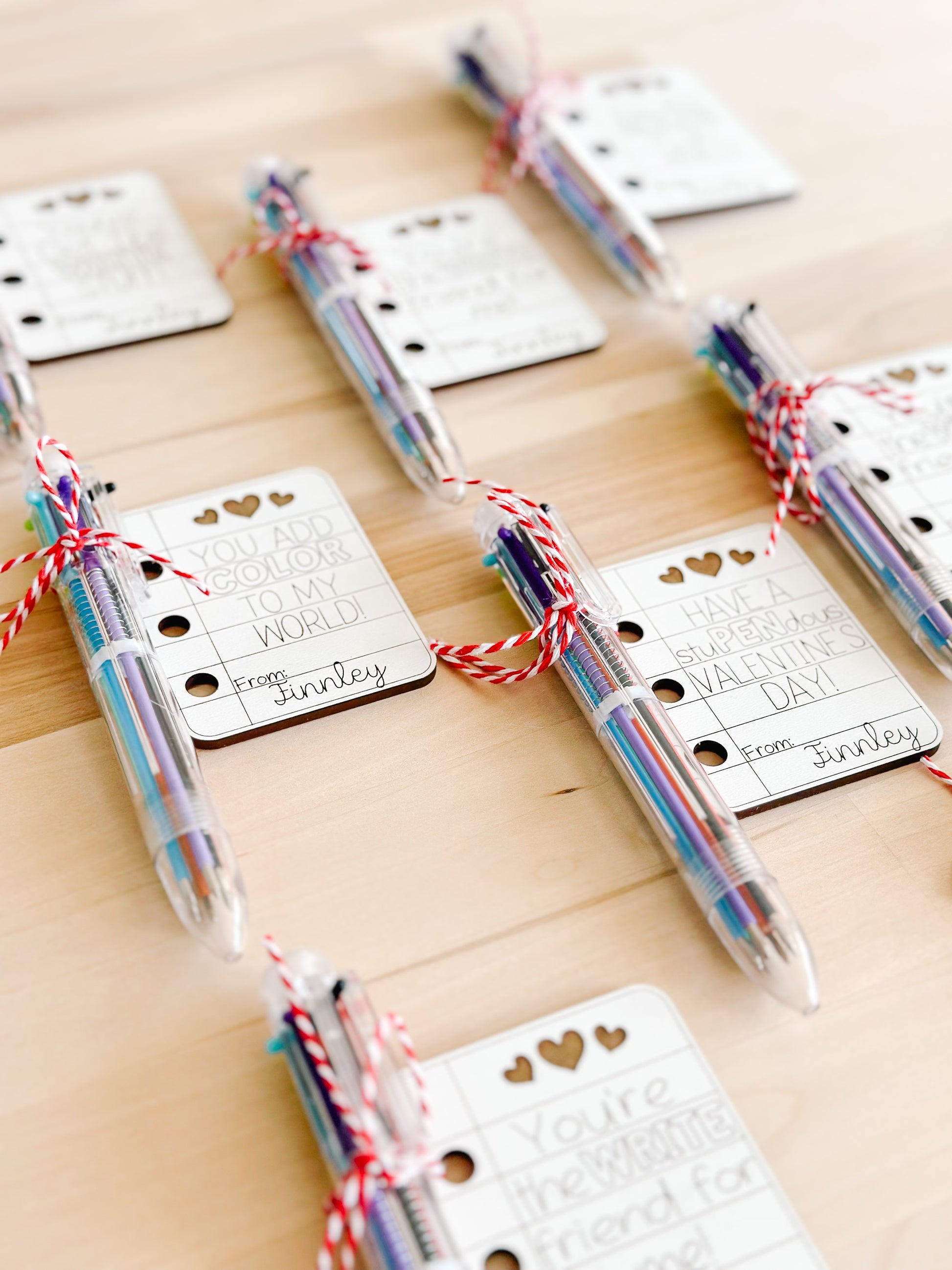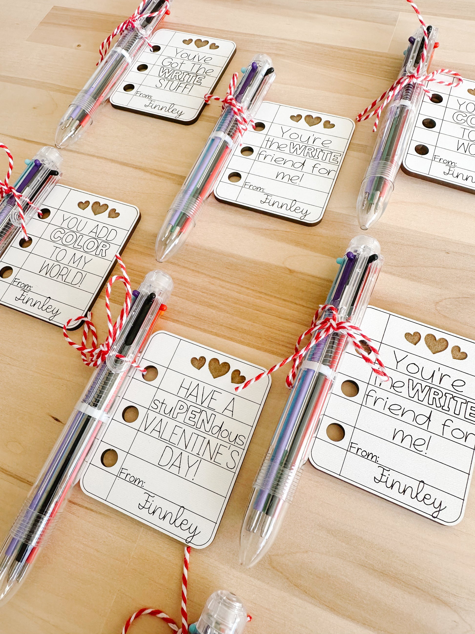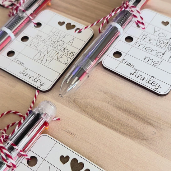 Each valentine is laser-cut from sturdy 1/8” white material and finished with a colorful 6-in-1 ballpoint pen attached — a favor kids will actually use!